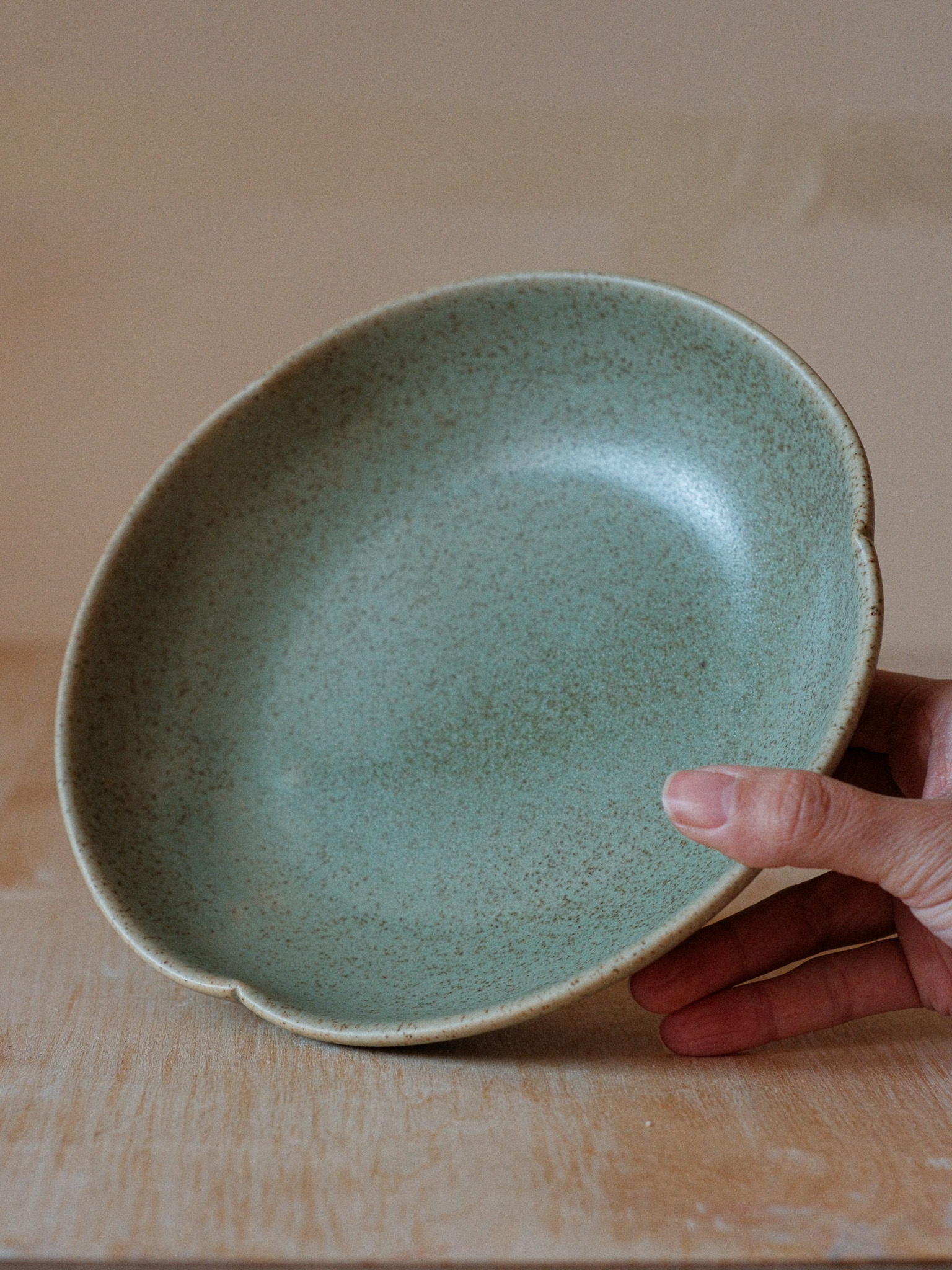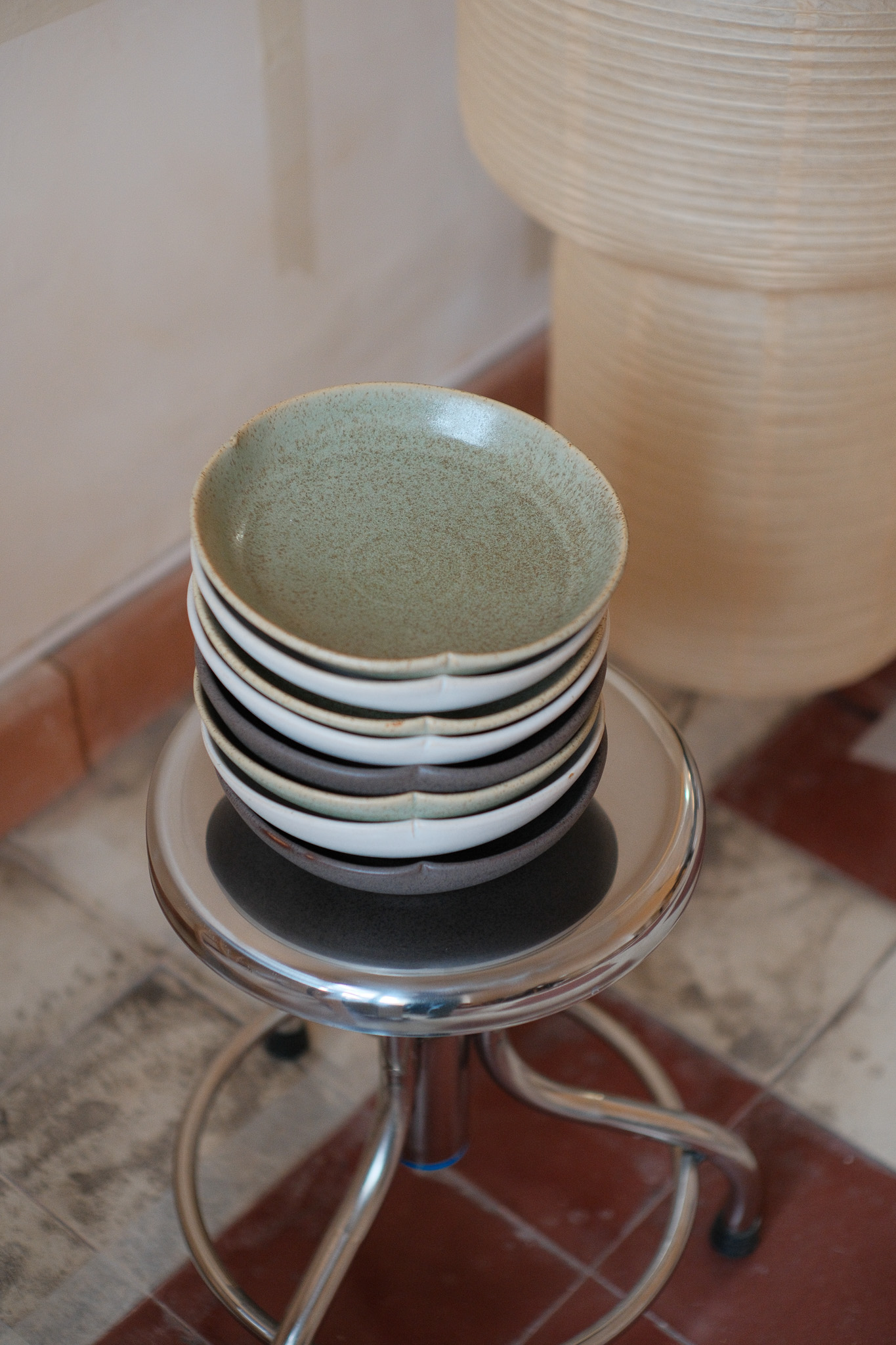 Glaze / Cardamome —A light, fresh green that deepens to ochre and warm brown where the glaze gathers. Reminiscent of fragrant spiced dishes, it brings character and subtle warmth to every meal. Each piece carries its own unique variation, shaped naturally by the glaze.
