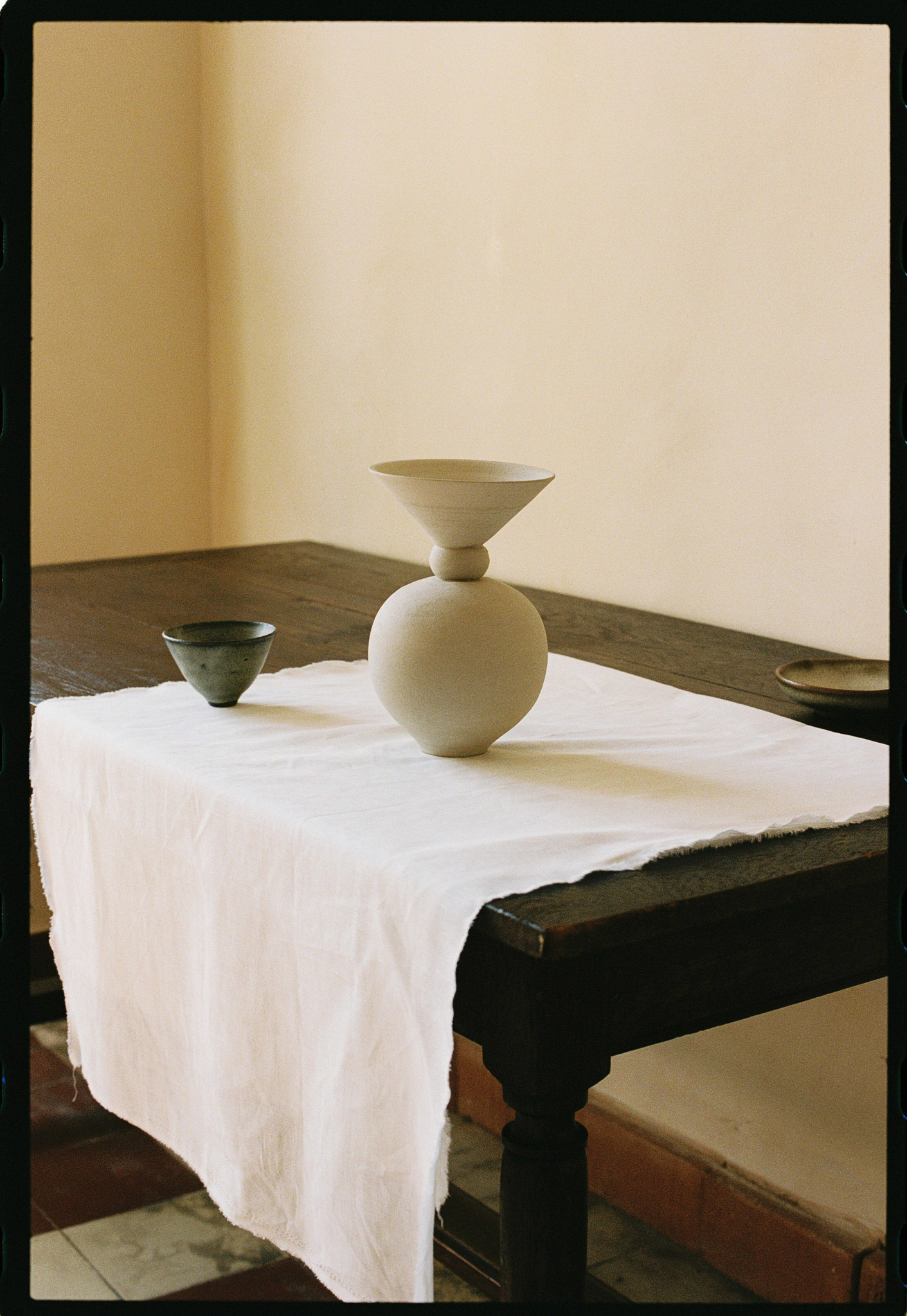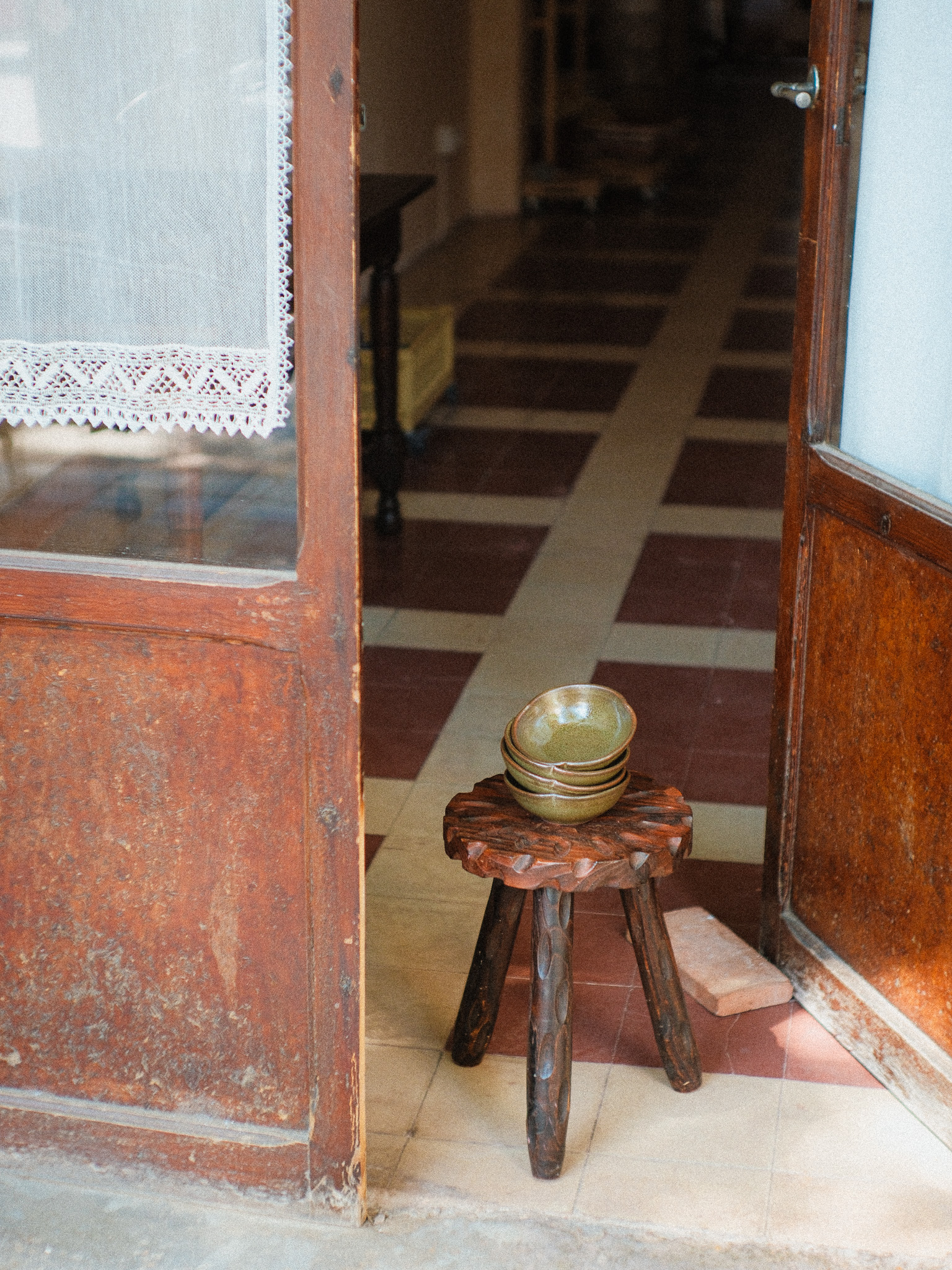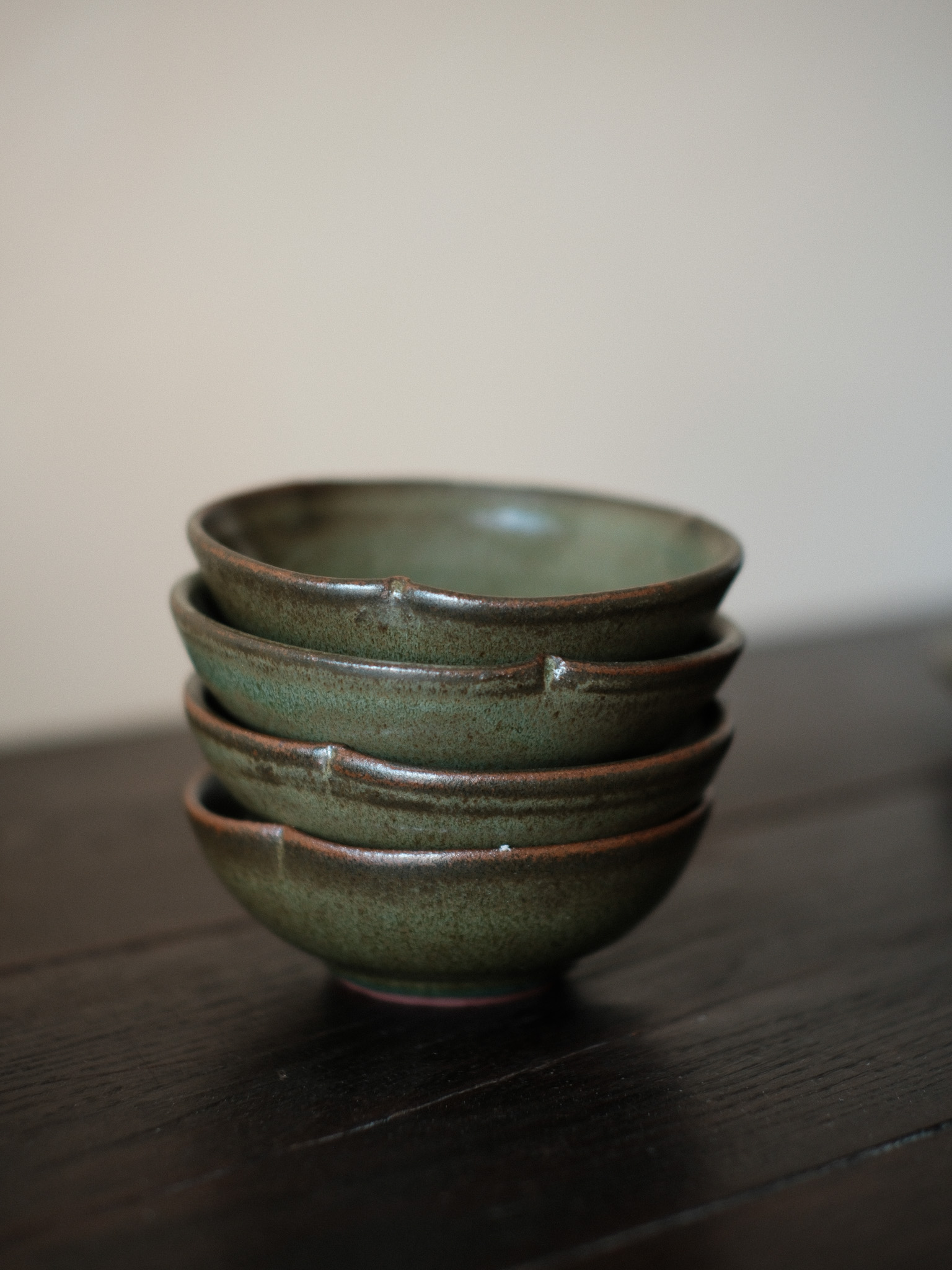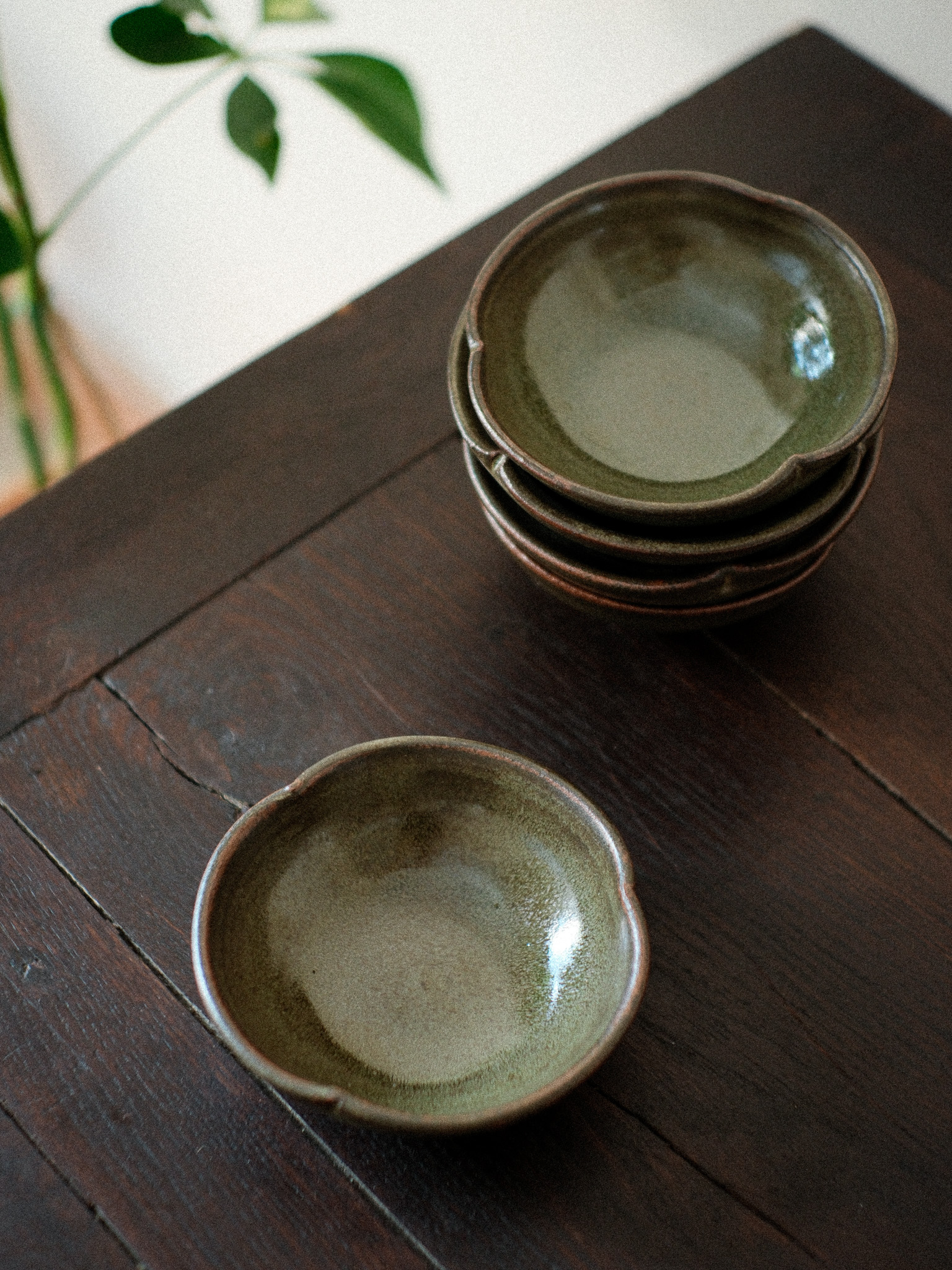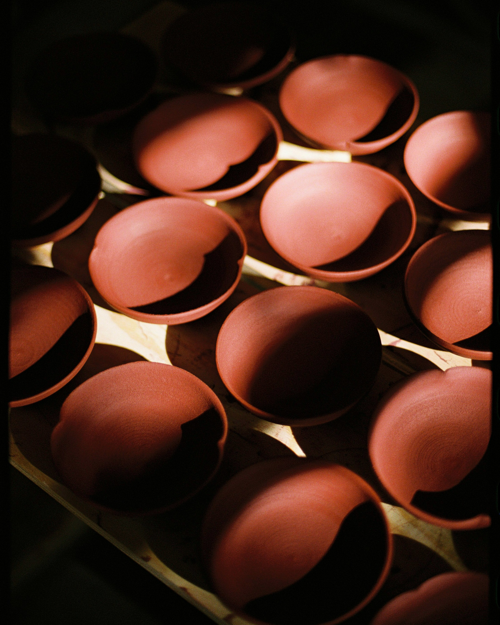 A mix of tableware, floral shaped plates and flared mugs. Handmade in iron-rich red clay. Offered in two glazes, Écume and Jade, derived from in-house glaze development and experimentation.